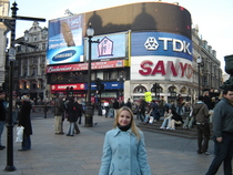 Off the Eye we walked back across the Thames. Along the bridge people were trying to take photos of themselves in front of the London Eye, but at night with the flash all they would see is themselves grinning in front of inky blackness with a few dots in a circle behind them (I know because I tested to see if it was worth a photo). Edyta commented on the duck-and-pull-a-face approach people have to walking in front of a pointed camera. How does the pulling a face avoid you being in their photo? Surely it would make you look even worse, not only have you ruined their shot, you look dopey too! At least these digital days allow you to make the shot again. Over the Thames we were in Trafalgar Square where they had set up a temporary snow-board competition. That brought back memories of Queenstown to me although this presentation was a little larger. We walked around trying to find Picadilly Circus again and instead found Leicester Square, home of the movie theatres (and a rogue street performer who had roped in a group of people to join her for some Indian dancing on the street and then had vanished a few minutes later when we returned by). After Pizza and Donuts for tea we found Picadilly Circus, took in some more sights of neon lights and then vanished back into the excessively warm and crowded Tube to begin the journey home.