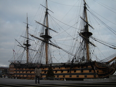 The train eventually got into Portsmouth at about 11am. So half the days light had been and gone by then. We got off at the last stop and headed towards the old ship masts. We paid the expensive price of a ticket to visit the HMS Victory. The ship was still in pretty good nick and if left to wander the lower decks by yourself you could easily get lost (especially at the front where the powder was stored). The tour was aimed a bit towards the kids. From an adults point of view it was good hearing where the expressions "Let the cat out", "Not enough room to swing a cat" and others came from. It was also interesting to hear that good old Nelson, after engineering the victory of Trafalgar was ceremoniously stored in a casket of brandy to preserve him on the return journey to England. Edyta got to learn there was a Battle of Trafalgar and a Vice-Admiral Nelson.