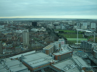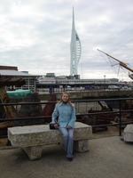 Once we were done with the naval yard we went looking for other items of interest in Portsmouth. A large spinnaker shaped tower caught our attention so we headed to that. First we had to get past the train station/ferry port. Two weekends in a row where a big port has got in our way. After a few starts in the wrong direction we found a tunnel that lead into some shops and to the base of the tower. There was a glass elevator on the side but it was out of order so we had to go to the top in the sardine lift (it opened at two ends, the people entering from one end got to push the people in it out the other end). The top of the tower was 110 metres high and neither of us could remember if it was taller than the Eiffel Tower. It wasn't as impressive. At the 100 metre mark there was a large glass floor you could walk over but it was covered in kids and hard to see the drop underneath it because of them.