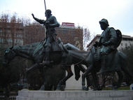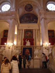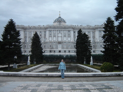 We walked to the Plaza de Espana (Madrid uses Spanish, not Catalunya, so we had to learn new words for places and food). There was a big statue of Don Quijote and his travelling companion Sancho. The Spanish just love that guy, they base half their culture on him (and for those who don't know he isn't any more real than Sherlock Holmes or James Bond). The fountains were turned off. We travelled across to the Jardines Sabatini garden, an area of the standard Spanish use of small gravel for paths with a surrounding of box hedges. Spain is normally a hot and dry place were few things grow, very different to the always green look of England. In fact Spain feels a lot more like Australia, except it gets a lot colder in winter. On the other side of the garden there was a big building. We went to look at it.
