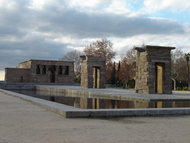 Eventually we made it to Plaza Puerta del Sol. It was crowded and not impressive. Edyta was feeling as bad as she had been in the morning so we walked on to find the big park with a big gate from the old city wall. We found the garden but missed the gate. We ended up off our little tour map. Instead of the gate we found a big rectangular lake and an impressive statue. This was the Parque del Buen Retiro and the statue was Alfonso the XII's mausoleum. There were shifty African gangs in the area so we moved off quickly. Being off the map meant I couldn't find the Metro stop to get home. Suddenly we came upon the gate I was aiming for in the first place, the Plaza de la Independencia. Satisfied, I'd took a picture and then we took the Metro back to our hotel. Before going into it we crossed to a nearby park to look at the Temple de Debod, an Egyption temple that was moved stone by stone to Spain when the valley it was in was to be flooded in 1970 (the temple is 4th century BC). There was a couple having wedding photos at the temple.